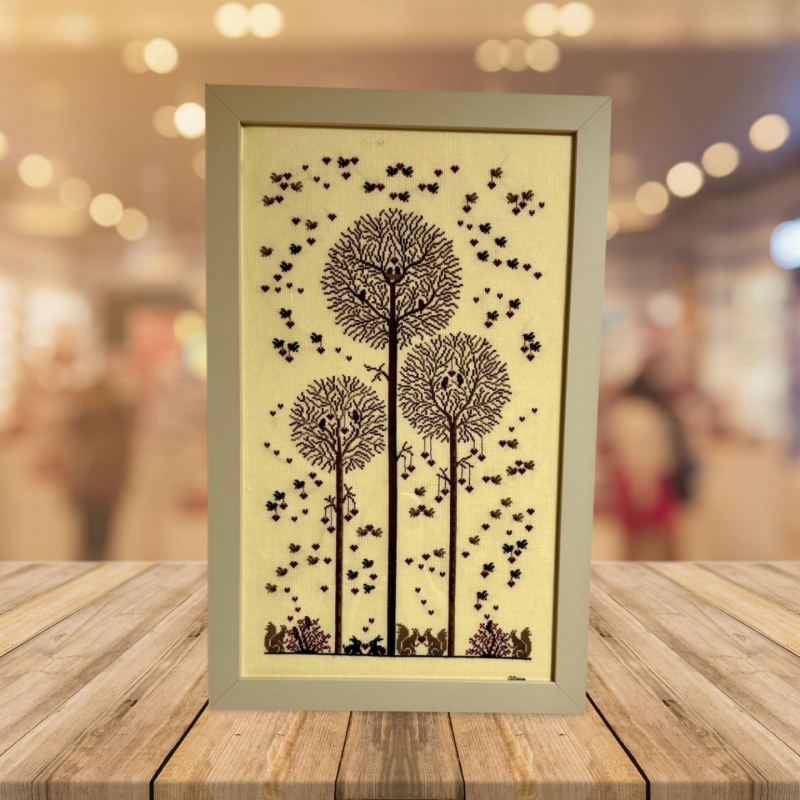 Dieses Bild können Sie erwerben. Es gibt noch eins mit den Bäumen und Vogelhäuschen, es dauert bis das ergänzendes Bild gestickt und gestaltet wird. Wenn es Ihnen gefällt, melden Sie sich, dann kann ich es schnell für Sie reservieren.