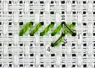 Nachdem wir in einer Richtung Stiche bis zur erforderlichen Länge gemacht haben, kehren wir zurück. Um den Kreuzstich mit dem oberen diagonalen Stich zu schliessen, machen wir jetzt den Stich unter dem gestickten.