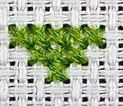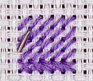 Wir machen die erste Reihe unterer Maschen, die Maschenrichtung ist von links unten nach rechts oben. Wir gehen zur zweiten Reihe über und sticken ebenfalls nur die unteren Stiche.