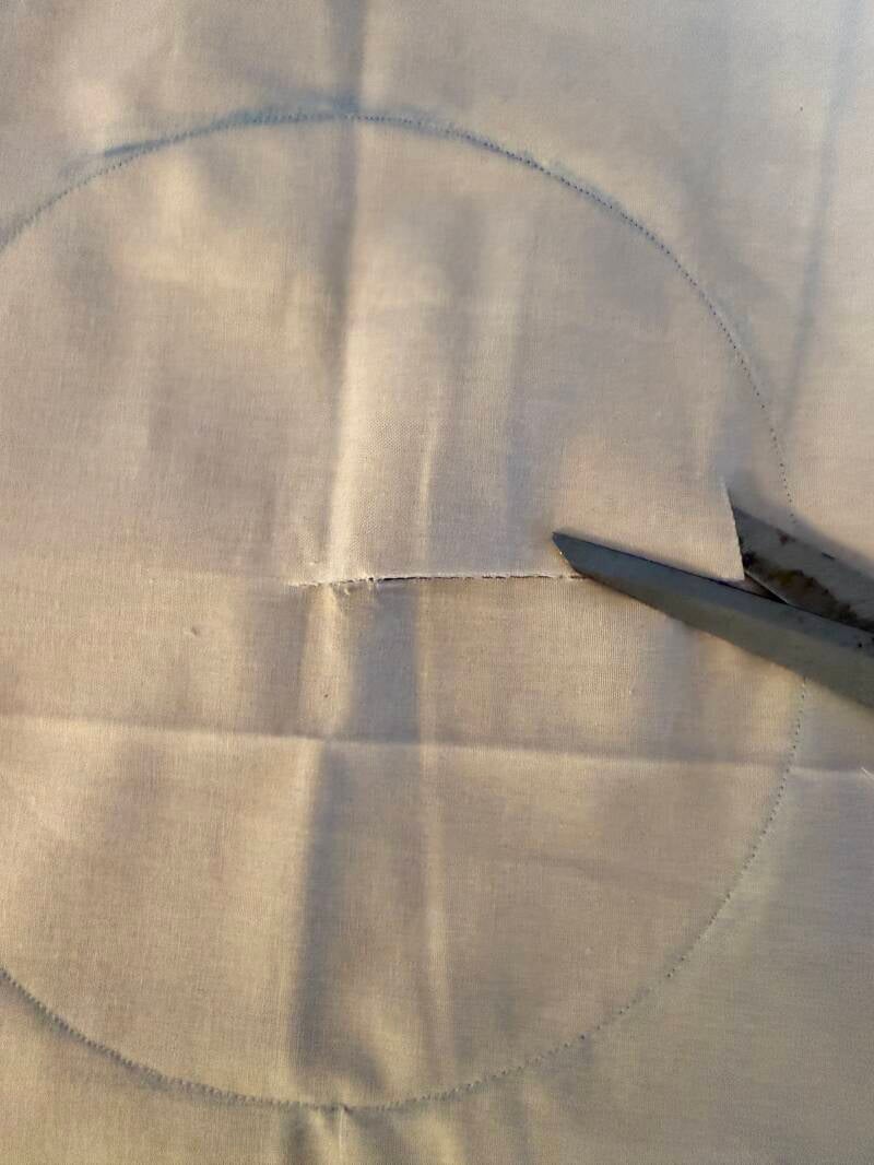 6. Ich schneide den Kreis aus der Mitte heraus , dabei lassen ich ca. 1 cm Stoff vor der Naht.