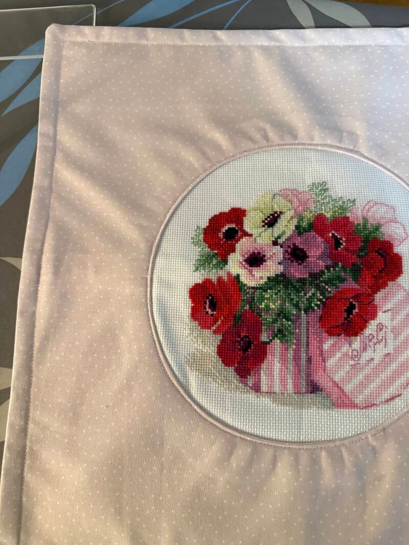 9. Nun, jetzt befestigen wir die Stickerei in das genähte Stofffenster.